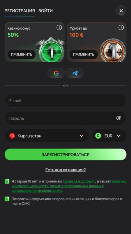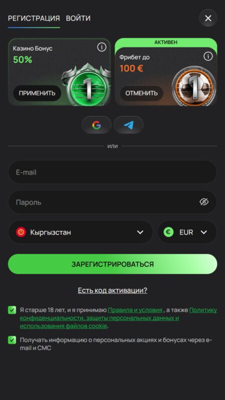 Подтвердите, что вам уже исполнилось 18 лет и вы даете свое согласие на получение уведомлений о бонусах и акциях. Нажмите на кнопку «Зарегистрироваться».