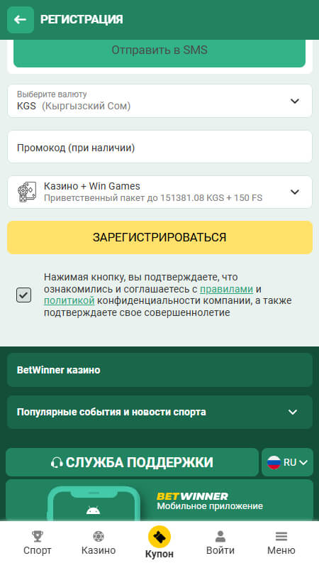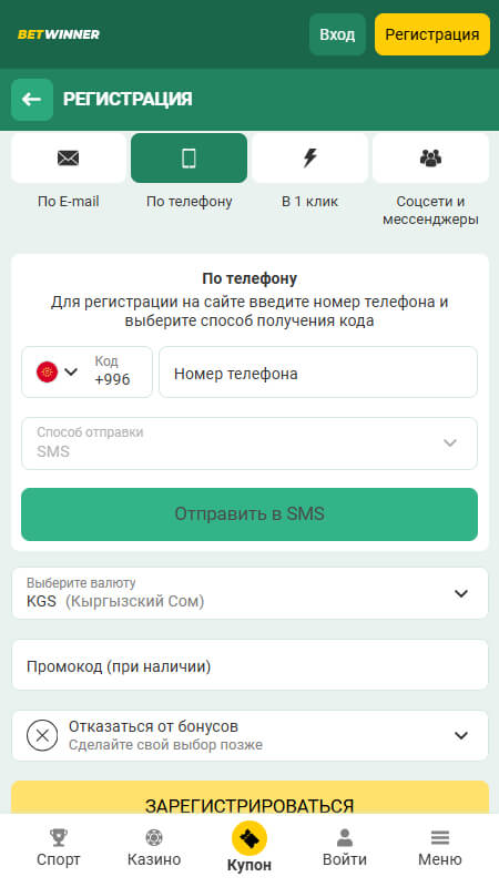 Регистрация на сайте Betwinner только 18+. Игроки из Кыргызстана могут зарегистрироваться здесь всего за пару минут. Чтобы создать аккаунт, следуйте пошаговой инструкции: