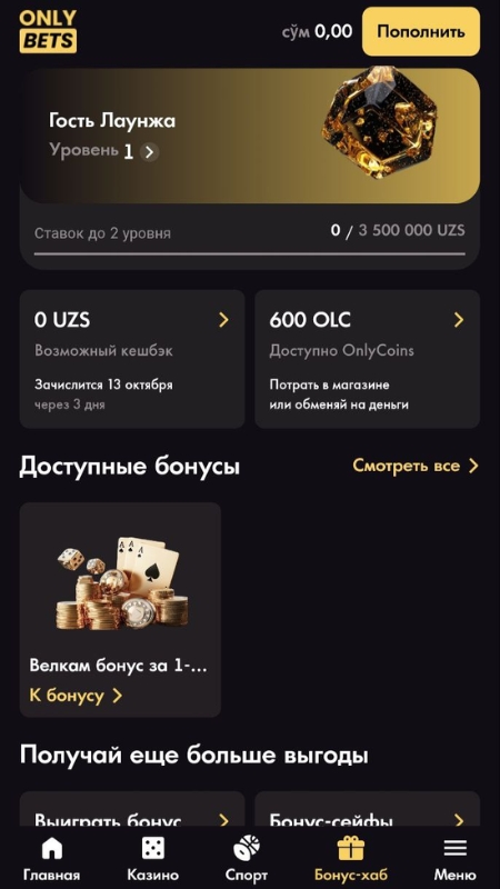 Статус «Резидент» с общей суммой ставок от 1 млн UZS увеличивает кешбэк до 3 %.