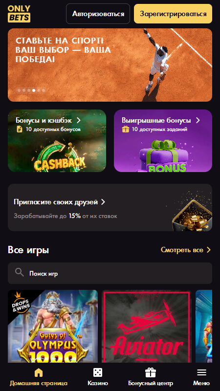 Кроме полноценного БК в OnlyBets весьма популярно казино. Сотни слотов — как алмазная шахта для ценителей настоящего азарта. Получится крутить барабаны и дожидаться фриспинов в самых топовых играх от более 50 известных провайдеров (Amatic, Evolution, Endorphina, Netent, Pragmatic Play и других):